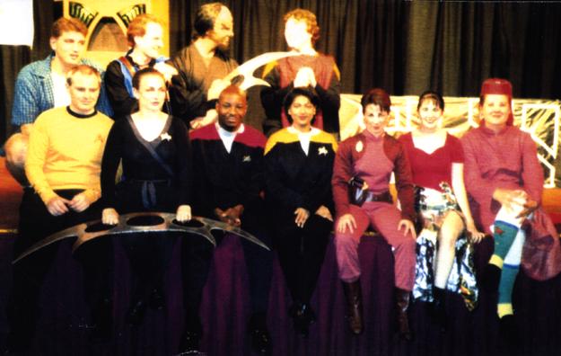 Then things got really wild. The play found itself without a director, and Christina asked me to direct with help from another friend of hers, Nancy O'Neill. Then we lost our Worf. We re-cast. Then we lost our Ensign. Not a huge part, we re-cast again. Then, just a week before the con, we lost our Kira. Cathy stepped in, learning lines and blocking in a phenomenally short rehearsal time. And then... we went to the con and had a ball.